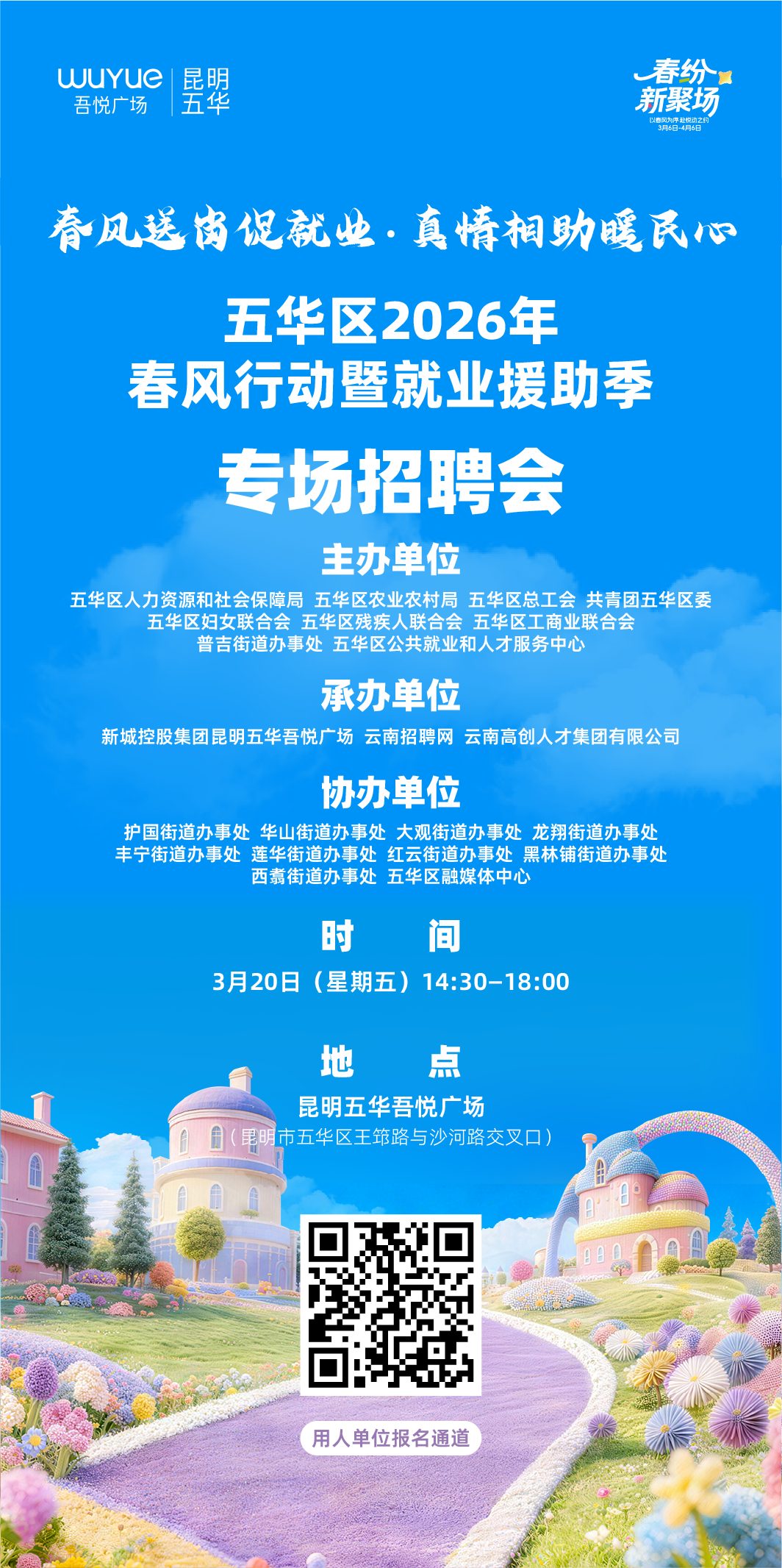 (一)有用人需求的单位请扫描上方海报“五华区2026年春风行动暨就业援助季专场招聘会(用人单位报名通道)”二维码,报名预约招聘会展位,当参会数量达到场地最大容量时将关闭报名通道。